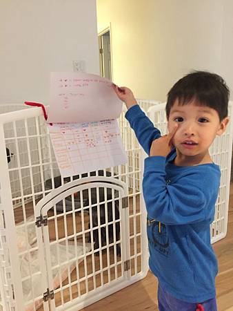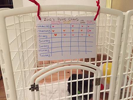積點表一定要放在家裡每天都常常看得到的地方。像我家是掛在狗籠上,包準每天照三餐看。這樣才能提醒孩子,更重要的是要不斷提醒父母自己,畢竟不停地讚美本來以為是理所當然的事情,實在有違父母天性。開始這個program之後,不但要一直注意到小孩做對的事,還要給予立即的讚美跟點數,剛開始的確很容易忘掉,的確需要多加提醒。